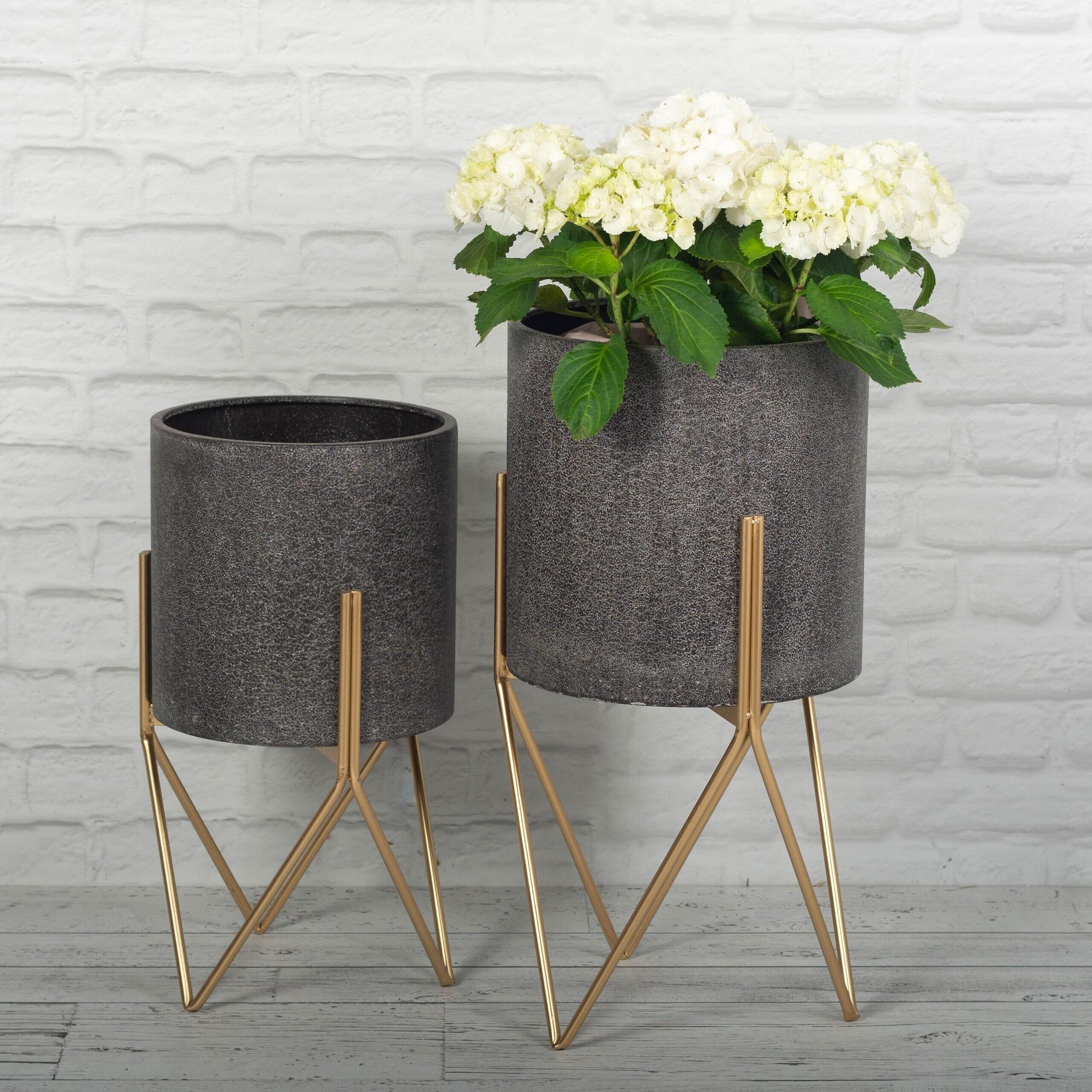 Set Of 2 Metal Pots On Gold Legs Plant Stand